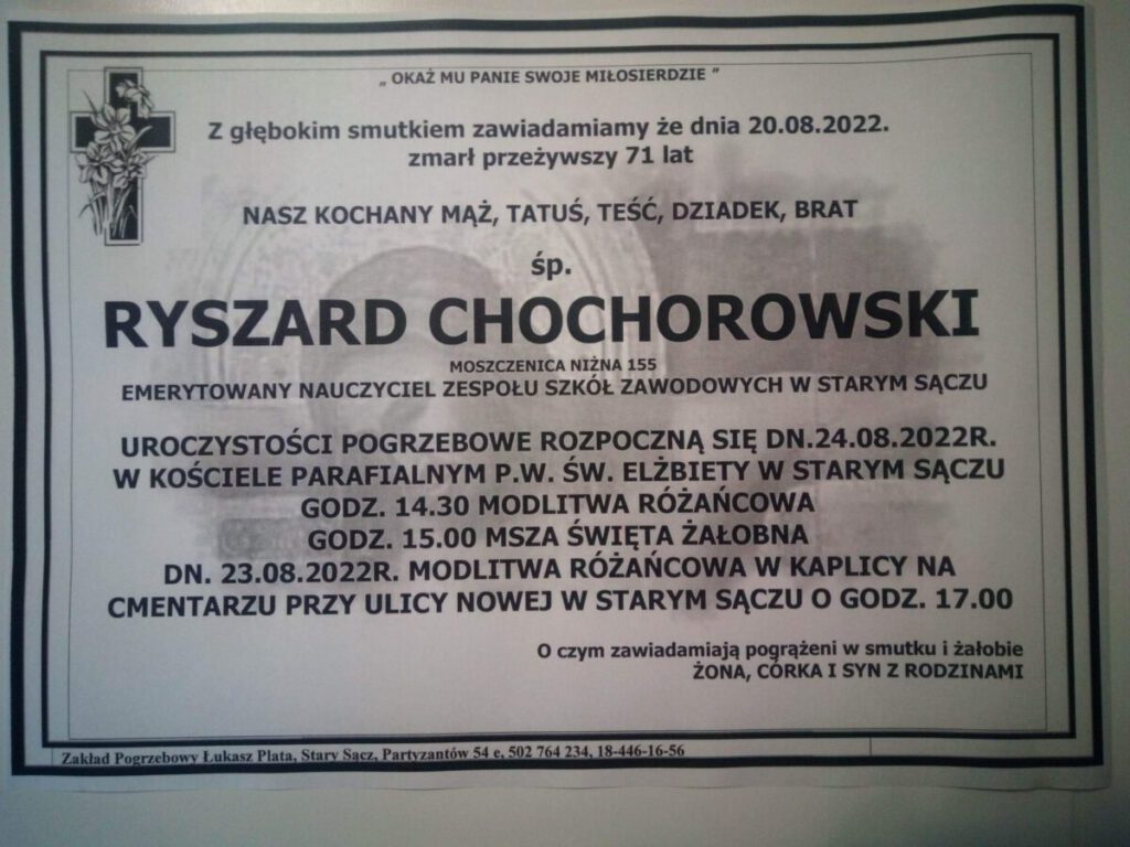 20 sierpnia 2022 roku w wieku 71 lat zmarł Ryszard Chochorowski, wieloletni nauczyciel geografii w Zespole Szkół w Starym Sączu a także kierownik Internatu w latach 1989-2002.