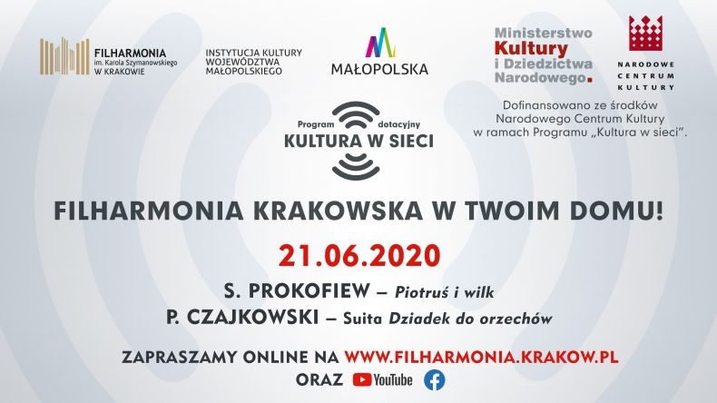 Filharmonia Krakowska inauguruje nowy cykl muzycznych transmisji w sieci. Podczas pierwszego koncertu zabrzmią bajkowe dzieła Czajkowskiego i Prokofiewa. „Filharmonia Krakowska w Twoim domu!” to cykl 8 premierowych koncertów, które krakowska instytucja zaprezentuje w internecie. Pierwszy z nich już w najbliższą niedzielę, 21 czerwca. W jego programie znajdą się wyjątkowe, związane z baśniową atmosferą dzieła symfoniczne. Najpierw melomani usłyszą bajkę muzyczną Segiusza Prokofiewa „Piotruś i wilk”, później zaś nie […]