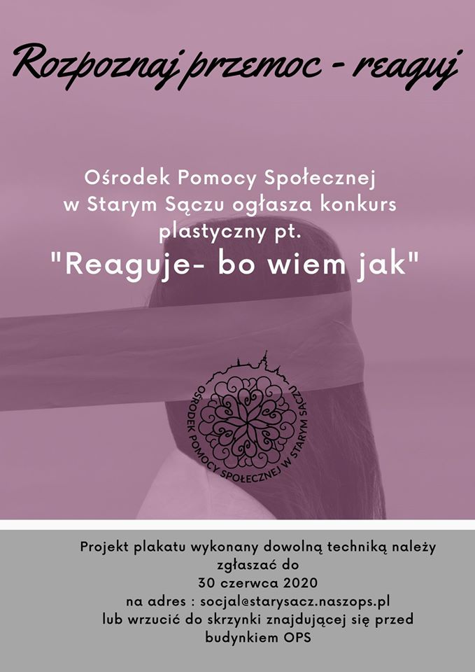 Ośrodek Pomocy Społecznej w Starym Sączu zachęca do wykonania projektu plakatu, który będzie zawierał informację gdzie mieszkańcy gminy Stary Sącz mogą zgłosić zjawisko przemocy. Plakat może być wykonany dowolną techniką, ważne żeby przykuwał uwagę oraz zawierał istotne informację. Wykonane prace wraz z formularzem należy przesłać na adres mailowy : socjal@starysacz.naszops.pl lub wrzucić do skrzynki znajdującej […]