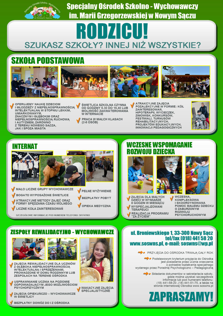 RODZICU dziecka niepełnosprawnego skorzystaj z bezpłatnej pomocy dla swojego dziecka już od I miesiąca życia w Specjalnym Ośrodku Szkolno – Wychowawczym M. Grzegorzewskiej w Nowym Sączu Mając na uwadze potrzeby dzieci niepełnosprawnych w Nowym Sączu i regionie oraz problemy, z którymi mierzą się ich rodzice, serdecznie zapraszamy do SPECJALNEGO OŚRODKA SZKOLNO – WYCHOWAWCZEGO. Oferta obejmuje zarówno […]