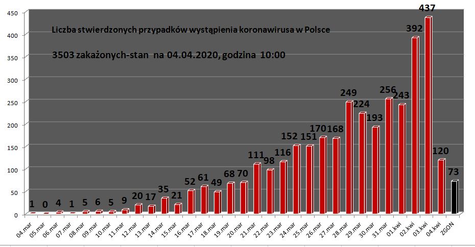 Dzisiaj (04.04.2020) odnotowano kolejnych 120 nowych przypadków zakażenia koronawirusem potwierdzonych pozytywnym wynikiem testów laboratoryjnych. Potwierdzone przypadki dotyczą: 50 osób z woj. śląskiego, 16 osób z woj. wielkopolskiego, 14 osób z woj. małopolskiego, 10 osób z woj. zachodniopomorskiego, 9 osób z woj. pomorskiego, 6 osób z woj. lubuskiego, 6 osób z woj. lubelskiego, 4 osób z woj. […]