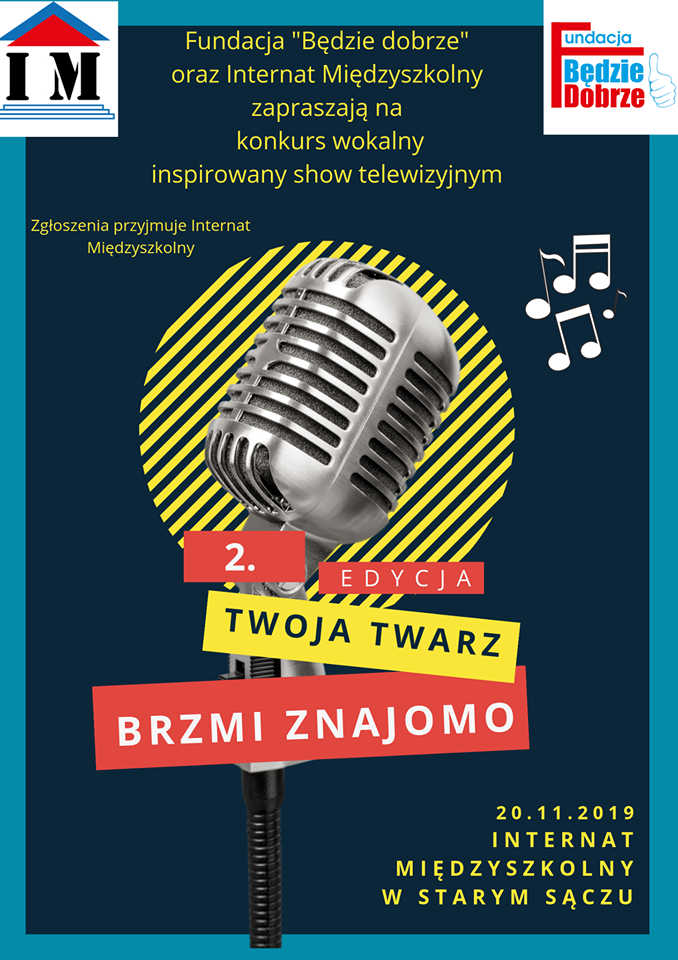 Fundacja Będzie Dobrze oraz Międzyszkolny Internat w Starym Sączu zaprasza na konkurs wokalny inspirowany show telewzyjnym „Twoja Twarz Brzmi Znajomo”. Szczegóły na www.internat.com.pl