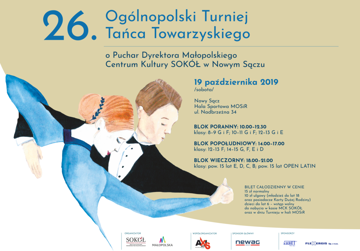 Zapraszamy 19 października (sobota) do hali widowiskowo-sportowej Miejskiego Ośrodka Sportu i Rekreacji w Nowym Sączu (ul. Nadbrzeżna 34), na 26. Ogólnopolski Turniej Tańca Towarzyskiego o Puchar Dyrektora Małopolskiego Centrum Kultury SOKÓŁ w Nowym Sączu. Pary prezentować się będą w trzech blokach programowych: porannym, popołudniowym oraz wieczornym. Uczestnikami turnieju są tancerze z klubów zrzeszonych w Polskim […]