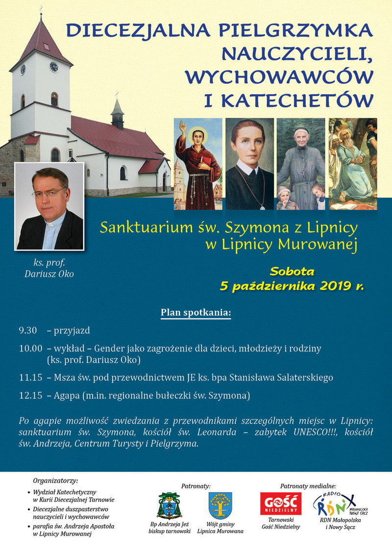 Diecezjalna Pielgrzymka Nauczycieli, Wychowawców i Katechetów odbędzie się 5 października w Lipnicy Murowanej. Gościem spotkania będzie ks. prof. Dariusz Oko, który będzie mówił o gender jako zagrożeniu dla dzieci, młodzieży i rodziny. Mszy św. o 11.15 będzie przewodniczyć bp Stanisław Salaterski.