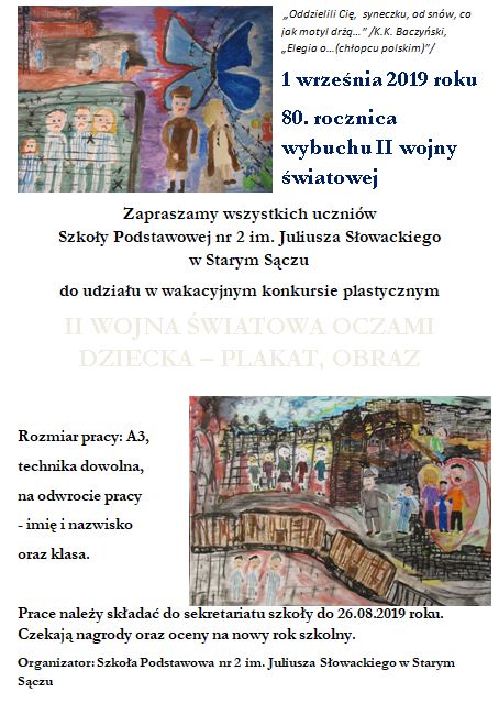 W związku ze zbliżającą się 80. rocznicą wybuchu II wojny światowej Szkoła Podstawowa nr 2 im. Juliusza Słowackiego w Starym Sączu organizuje dla wszystkich uczniów szkoły wakacyjny konkurs plastyczny pod hasłem: II wojna światowa oczami dziecka- plakat, obraz (rozmiar pracy A3, technika dowolna). Ostateczny termin składania prac konkursowych do sekretariatu szkoły mija w poniedziałek, 26 […]