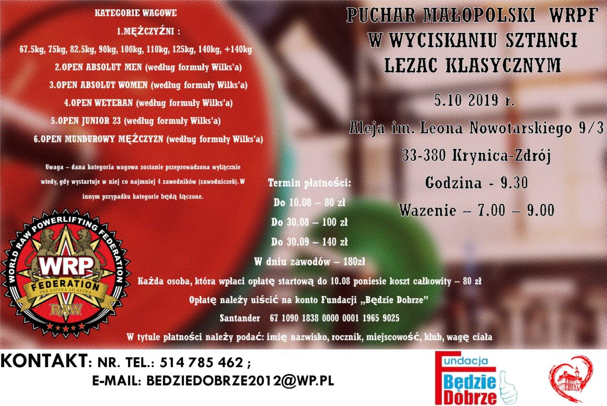 Puchar Małopolski WRPF w wyciskaniu sztangi leżąc klasycznym – Krynica – Zdrój 2019 Cele: Popularyzacja zdrowego stylu życia i sportowego spędzania wolnego czasu Propagowanie dyscyplin siłowych – wyciskanie sztangi leżąc Integracja środowisk sportowych oraz organizacji zajmujących się kulturą fizyczną Promocja Miasta oraz miejskich organizacji sportowych Termin i miejsce: 5 października 2019 r. 9.30 Ważenie – […]