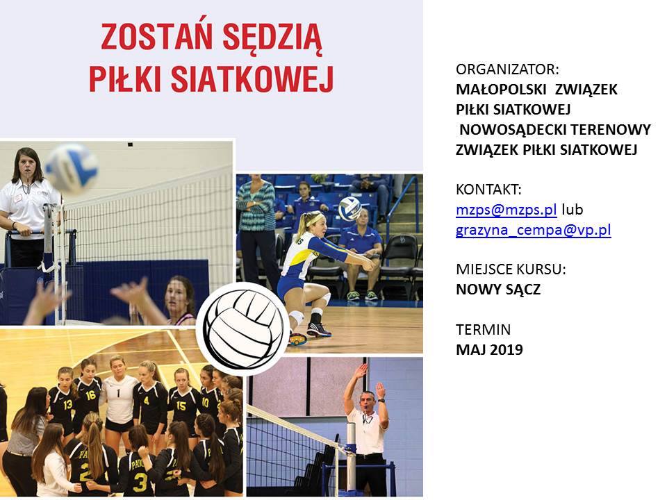 Wydział Sędziowski Małopolskiego Związku Piłki Siatkowej uprzejmie informuje, że wraz z Terenowym Związkiem Piłki Siatkowej w Nowym Sączu organizuje Kurs dla kandydatów na sędziego piłki siatkowej Małopolskiego Związku Piłki Siatkowej. Szczegóły na plakacie i w dokumentach poniżej: REGULAMIN PODANIE (pdf) , PODANIE (docx)