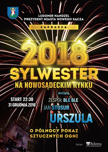 Prezydent Ludomir Handzel zaprasza na Rynek Nowego Sącza, na pożegnanie starego 2018 i powitanie nowego 2019 roku. Gwiazdą zabawy sylwestrowej będzie Urszula, która świętuje jubileusz 35-lecia pracy artystycznej.Podczas zabawy sylwestrowej na nowosądeckim Rynku przewidziano także występ Jana Stosura oraz zespołu Ble Ble, a o północy efektowny pokaz sztucznych ogni.