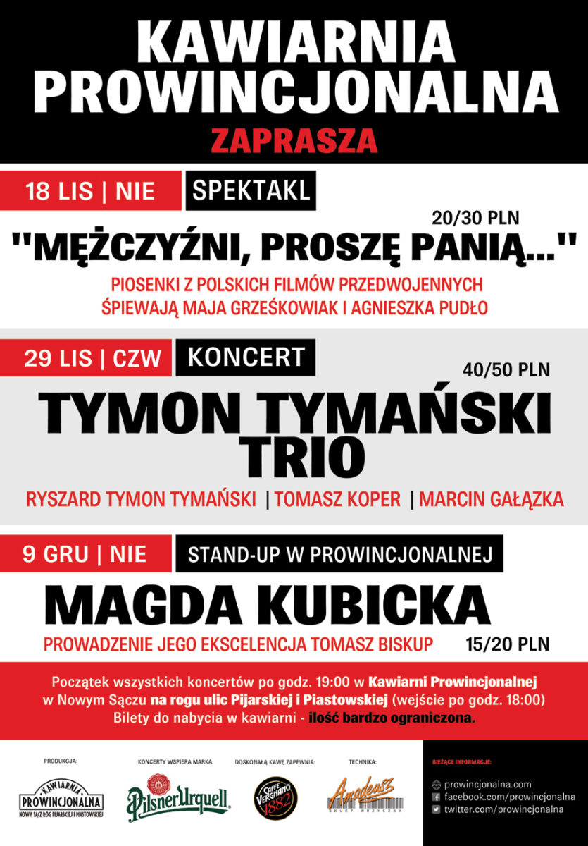Kawiarnia Prowincjonalna w Nowym Sączu (róg ul. Pijarskiej i Piastowskiej)zaprasza w czwartek 29 listopada na koncert Tymon Tymański Trio. Zespół to jeden z projektów Ryszarda Tymona Tymańskiego – wokalisty, kompozytora, multiinstrumentalisty, znaczącej postaci na polskiej scenie muzycznej. Tymański zagra razem z gitarzystą Marcinem Gałązką i perkusistą Tomaszem Koprem. Początek koncertu po godzinie 19:00(wejście po 18:00). […]