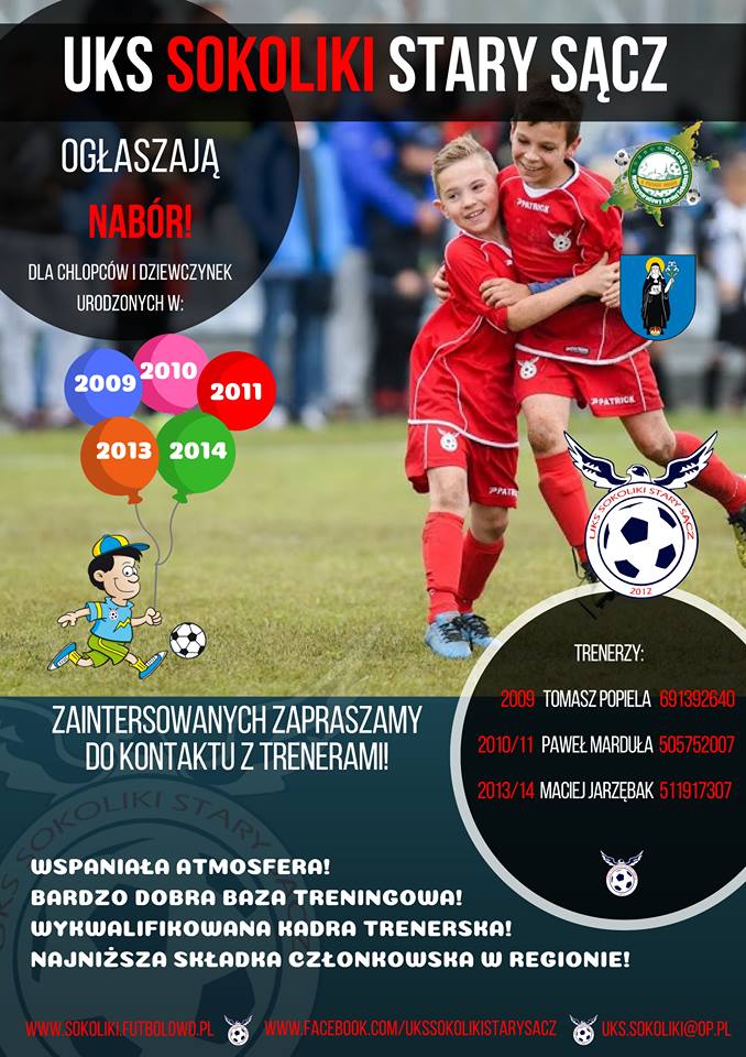 Zapraszamy wszystkie dzieci urodzone w 2009, 2010 , 2011, 2013 i 2014 roku na zajęcia na boiska przy MKS Sokół w Starym Sączu. Zajęcia odbywają się w miłej atmosferze i mają charakter zabawowy z elementami piłki nożnej. Szczegóły na plakacie
