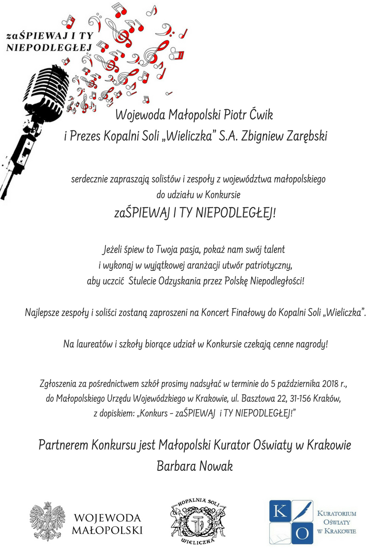 Wojewoda Małopolski Piotr Ćwik i Prezes Kopalni Soli „Wieliczka” S.A. Zbigniew Zarębski zapraszają do udziału w Konkursie „zaŚPIEWAJ I TY NIEPODLEGŁEJ”. Partnerem Konkursu jest Małopolski Kurator Oświaty Barbara Nowak. Do pobrania: Regulamin konkursu Załącznik nr 1 – zgłoszenie utworu muzycznego Załącznik nr 2 – zgoda na przetwarzanie danych osobowych oraz wykorzystanie wizerunku Załącznik nr 3 […]