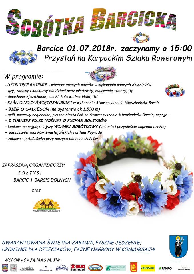 Już w najbliższą niedzielę (1 lipca) o godzinie 15:00 na Przystani na Karpackim Szlaku Rowerowym w Barcicach odbędzie się Sobótka Barcicka. W programie m.in: Dziecięce Bajenie, gry i zabawy, Baśń o Nocy Świętojańskiej, Bieg o Salceson, I Turniej Piłki Nożnej o puchar sołtysów i konkurs na najpiękniejszy wianek sobótkowy. Organizatorzy: Sołtys Barcic i Barcic Dolnych