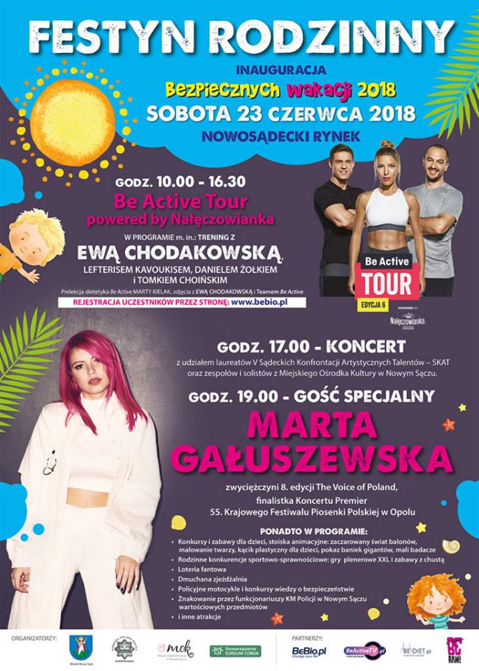 Bezpieczne Wakacje 2018 rozpocznie Festyn Rodzinny, który będzie miał miejsce w sobotę (23 czerwca) na rynku w Nowym Sączu. Na uczestników czekają wspaniałe atrakcje, a wśród nich m.in.: trening z Ewą Chodakowską oraz koncert Marty Gałuszewskiej. Festyn Rodzinny na płycie sądeckiego rynku potrwa od godz. 10:00 do godz. 16:30, a w programie znajdą się nie tylko konkursy i zabawy, ale również trening z Ewą […]