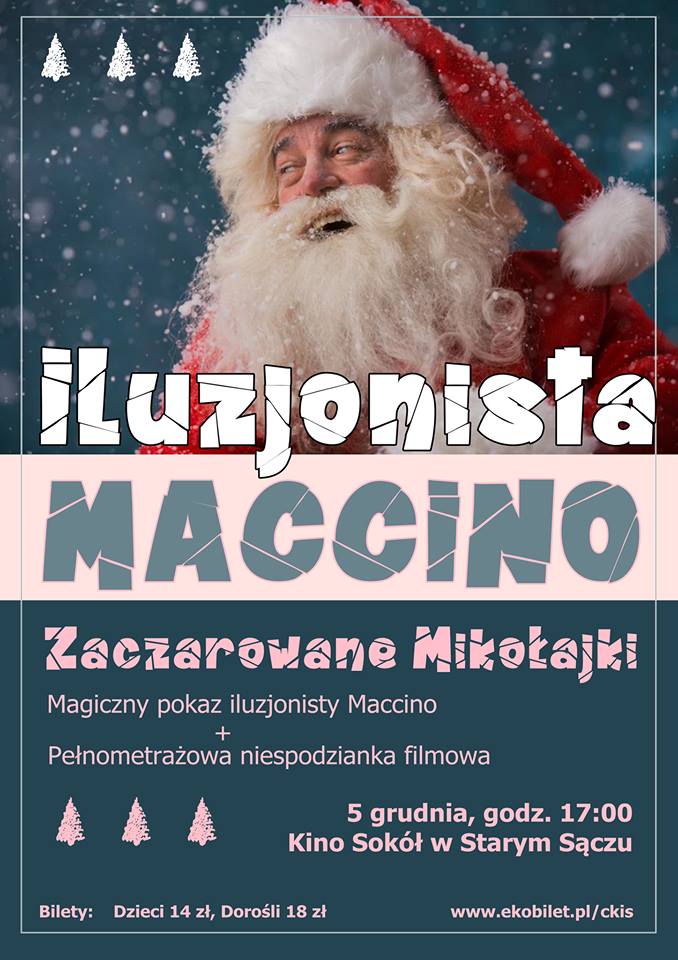 5 grudnia w starosądeckim Sokole odbędzie się mikołajkowy pokaz iluzjonisty Maccino przygotowany specjalnie na tę okazję + film (film niespodzianka o tematyce świątecznej). Iluzjonista Maciej (Maccino) Szymański, pochodzi z Iławy i jest prawdopodobnie najmłodszym zawodowym iluzjonista scenicznym w Polsce. Sztuką iluzji interesuje się od 6 roku. W wieku 16 lat postanowił, że zostanie profesjonalnym iluzjonistą […]