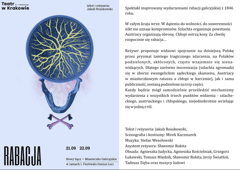 Serdecznie zapraszamy do wzięcia udziału w spektaklu / widowisku pt. RABACJA w wykonaniu aktorów Teatru im. J. Słowackiego w Krakowie, który odbędzie się w dniach 21 i 22 września 2017 r. w Miasteczku Galicyjskim. Spektakl inspirowany jest wydarzeniami rabacji galicyjskiej z 1846 roku. Spektakl „RABACJA” pokazy: 21 oraz 22 września 2017 r., godz. 18:00 miejsce: […]