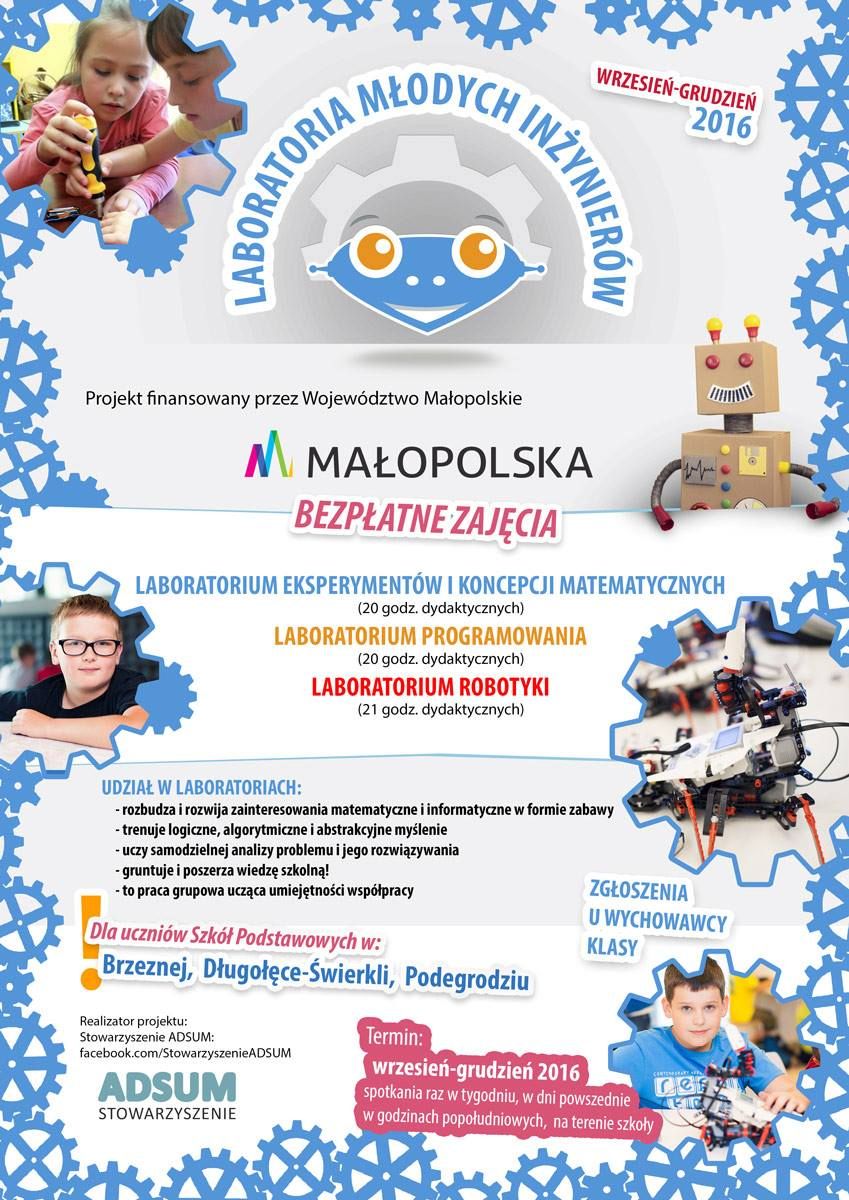 W ramach projektu pn. Laboratoria Młodych Inżynierów w bieżącym tygodniu Stowarzyszenie ADSUM z Brzeznej rozpoczyna realizację cyklu bezpłatnych warsztatów pozaszkolnych dla dzieci i młodzieży w wieku 7-12 lat. Adresatami laboratoriów są uczniowie ze szkół podstawowych z Brzeznej, Długołęki-Świerkli oraz Podegrodzia. Celem projektu jest rozwinięcie u 90 uczestników zajęć kompetencji kluczowych w zakresie technologii informacyjno-komunikacyjnych oraz […]