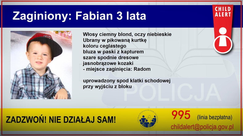 Uruchomiono CHILD ALERT! Dziś ok. 6:50 spod klatki schodowej bloku w Radomiu przy ul. Świętokrzyskiej został uprowadzony trzyletni Fabian. Porwania dokonało trzech zamaskowanych mężczyzn. Chłopiec ubrany był w pikowaną kurtkę koloru ceglastego, bluzę w paski z kapturem, szare dresowe spodnie i jasnobrązowe kozaki. Child Alert to system uruchamiany w szczególnych sytuacjach, kiedy istnieje realne zagrożenie życia […]