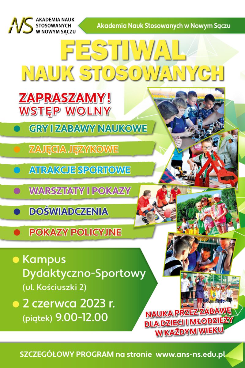 Zapraszamy na Festiwal Nauk Stosowanych w Akademii Nauk Stosowanych w Nowym Sączu, który odbędzie się w dniu 2 czerwca 2023 r. godz. 9:00–12:00 na terenie Kampusu dydaktyczno-sportowego przy ul. Kościuszki 2 w Nowym Sączu. W roku akademickim 2022/2023 to wydarzenie ma charakter specjalny, ponieważ wpisuje się jubileusz 25-lecia istnienia Uczelni. Festiwal ma na celu propagowanie nauki, a przede wszystkim zaszczepienie u młodych ludzi pasji poznawania, tworzenia […]