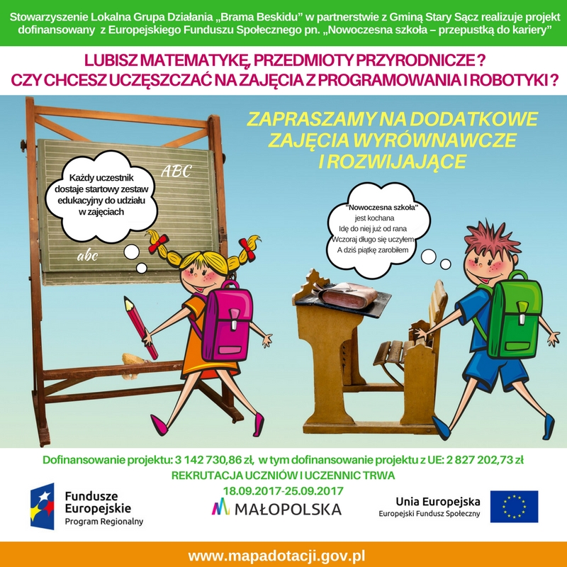Informujemy, że rekrutacja uczniów i uczennic z terenu Miasta i Gminy Stary Sącz do projektu „Nowoczesna szkoła – przepustką do kariery” rozpoczęła się 18.09.2017 r. Zapisy trwać będą do 25.09.2017 r. Wypełnione dokumenty zgłoszeniowe należy składać do 25.09.2017 r. w Szkolnych biurach projektu lub w siedzibie Bramy Beskidu- decyduje kolejność zgłoszenia i kompletność dokumentacji. „Drugi etap rekrutacji […]