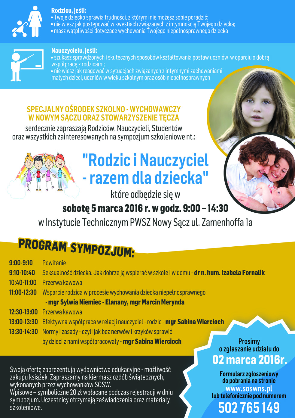 5 marca w Instytucie Technicznym Państwowej Wyższej Szkoły Zawodowej w Nowym Sączu odbędzie się sympozjum „Rodzic i Nauczyciel – razem dla dziecka”. Spotkanie organizuje Specjalny Ośrodek Szkolno-Wychowawczy w Nowym Sączu oraz Stowarzyszenie Tęcza. Zaproszeni są na nie rodzice i nauczyciele. W programie m.in. wykłady na temat: Seksualność dziecka. Jak dobrze ją wspierać w szkole i […]