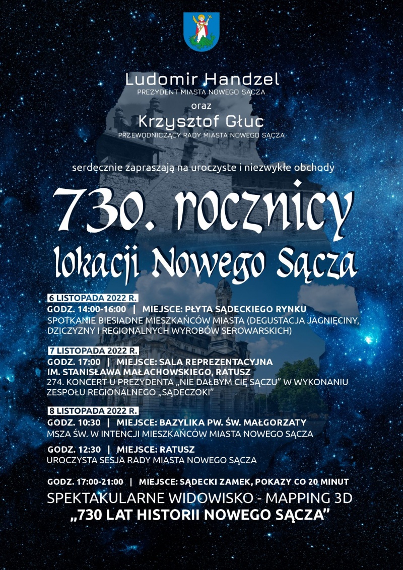 Ludomir Handzel – Prezydent Miasta Nowego Sącza oraz dr Krzysztof Głuc – Przewodniczący Rady Miasta Nowego Sącza serdecznie zapraszają na uroczyste i niezwykłe obchody 730. rocznicy lokacji Nowego Sącza. Uroczystości rozpoczęły się już wczoraj na płycie sądeckiego rynku. W programie jeszcze: 7 listopada 2022 r. godz. 17:00:274. Koncert u Prezydenta pt. „Nie dałbym Cię Sączu” […]