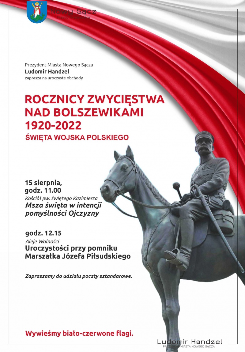 Prezydent Miasta Nowego Sącza Ludomir Handzel zaprasza na uroczyste obchody rocznicy zwycięstwa nad bolszewikami 1920-2022 Święta Wojska Polskiego, które odbędzie się 15 sierpnia. Uroczystości rozpoczną się o godzinie 11:00 mszą świętą w intencji pomyślności Ojczyzny, o godzinie 12:15 odbędą się również uroczystości przy pomniku Marszałka Józefa Piłsudskiego. Szczegóły na plakacie.