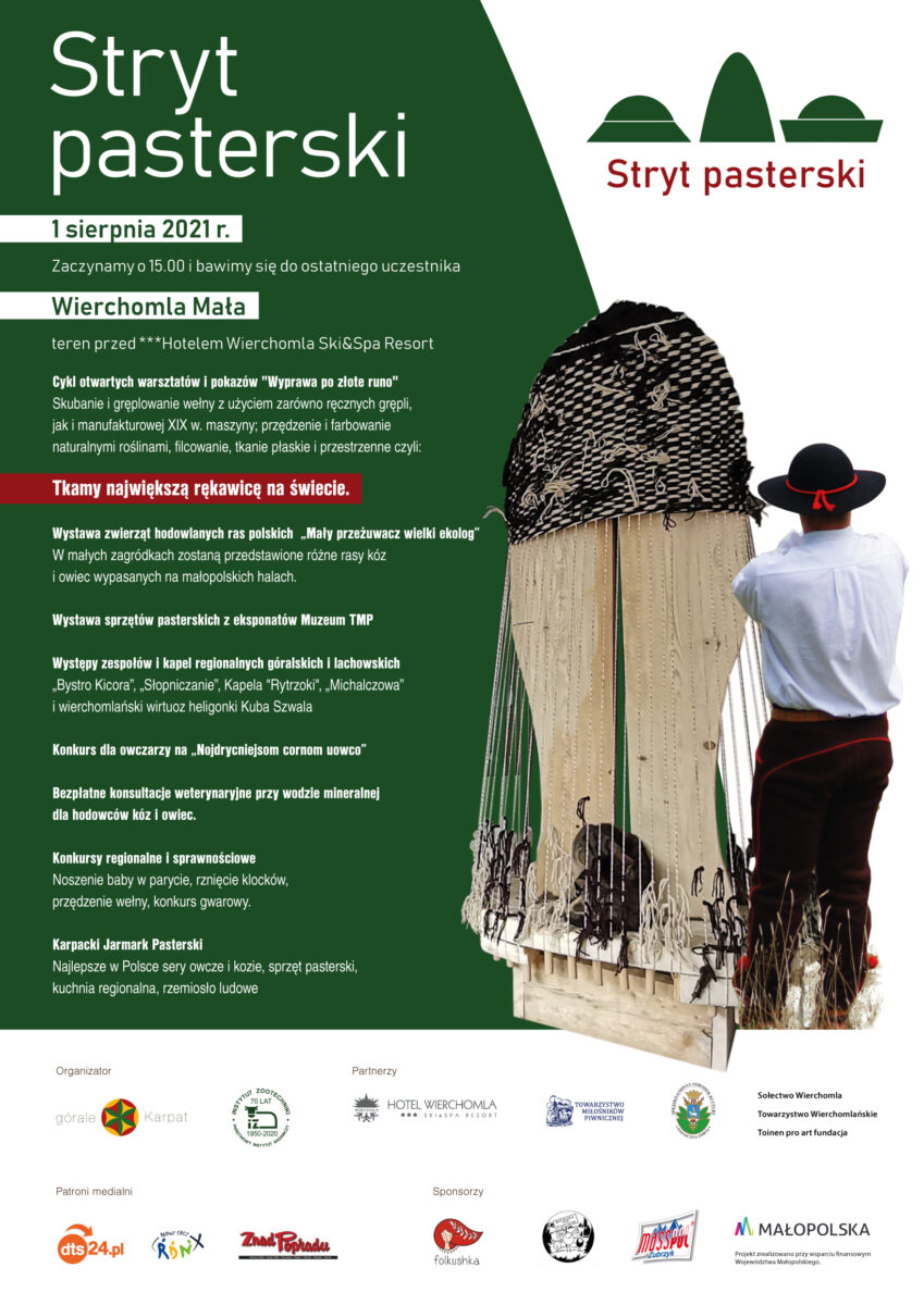 1 sierpnia w Wierchomli, kończymy tkanie największej na świecie pary rękawic furmańskich. Wcześniej pokażemy jak taka rękawica powstaje. Od strzyżenia owiec poprzez, gręplowanie, przędzenie i farbowanie. Na strycie będzie też można spotkać Nojdrycniesom Cornom uOwco, dowiedzieć się czemu Lach nie jest góralem skoro w górach mieszka i czym różni się cakiel od owcy górskiej. ZAPRASZAMY!