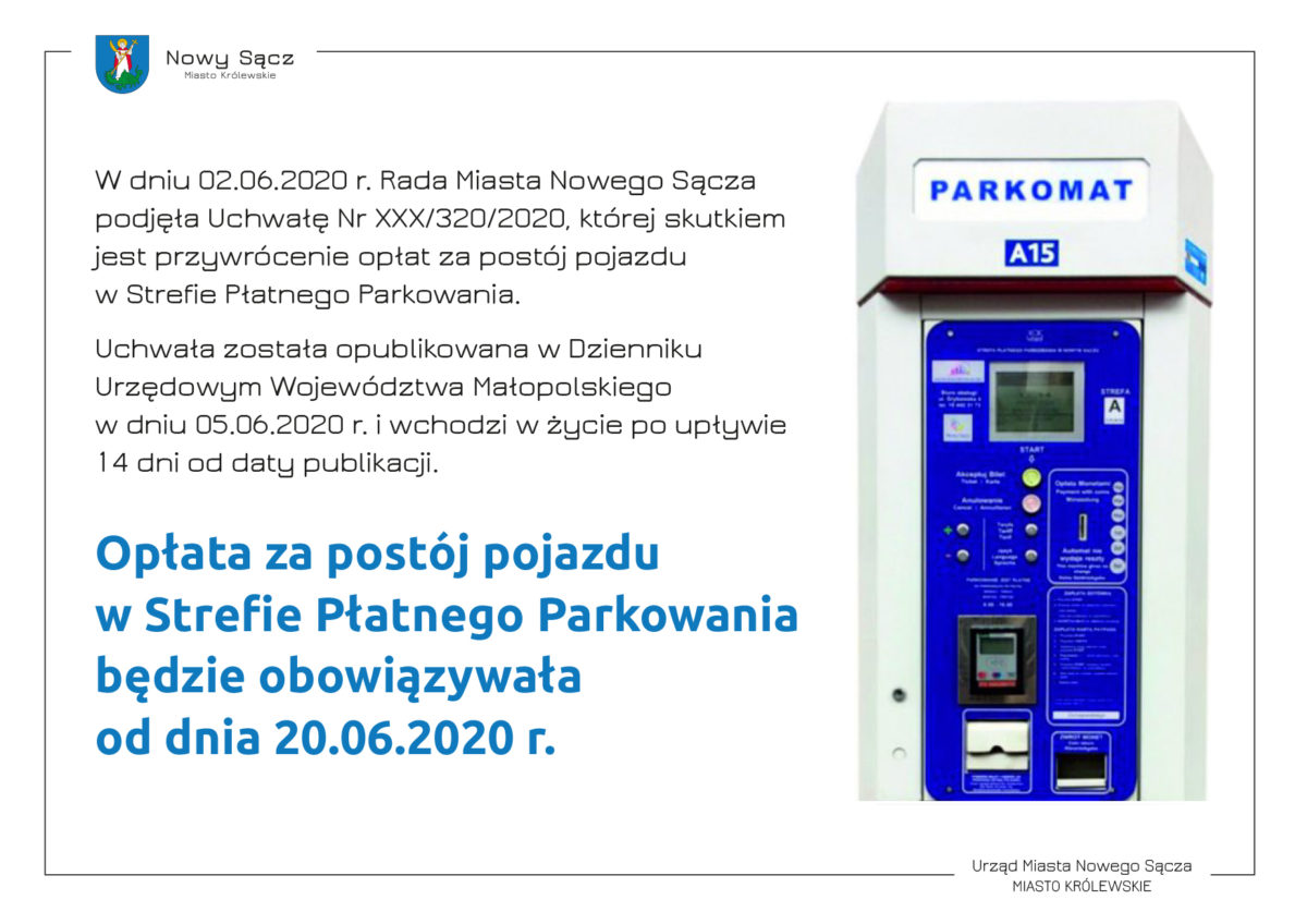 W dniu 02.06.2020r. Rada Miasta Nowego Sącza podjęła Uchwałę Nr XXX/320/2020, której skutkiem jest przywrócenie opłat za postój pojazdu w Strefie Płatnego Parkowania. Uchwała została opublikowana w Dzienniku Urzędowym Województwa Małopolskiego w dniu 05.06.2020 r. i wchodzi w życie po upływie 14 dni od daty publikacji. Opłata za postój pojazdu w Strefie Płatnego Parkowania będzie obowiązywała […]