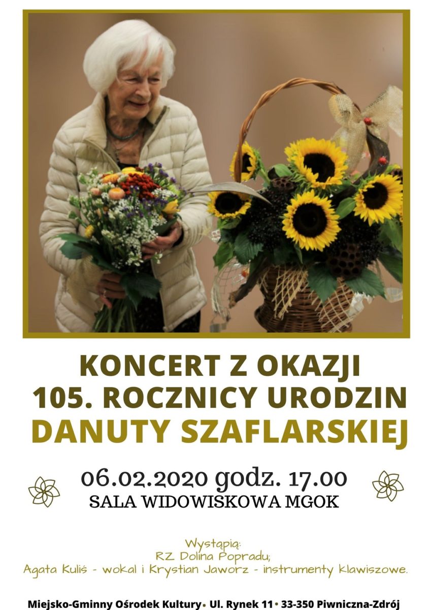 Szanowni Państwo, mamy zaszczyt zaprosić na koncert z okazji 105. rocznicy urodzin Danuty Szaflarskiej, który odbędzie się dnia 6 lutego 2020 roku (czwartek) o godz. 17:00 w sali widowiskowej Miejsko-Gminnego Ośrodka Kultury w Piwnicznej-Zdroju, ul. Rynek 11, Piwniczna-Zdrój. Danuta Szaflarska była wielką damą polskiego kina i teatru, niedoścignioną ikoną wdzięku, dobrą i mądrą kobietą. Urodziła […]
