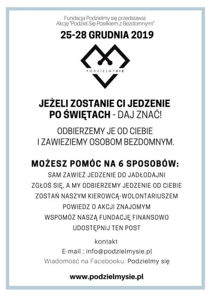 www.podzielmysie.pl Miejsce: Parafialny Oddział Caritas przy parafii św. Ducha w Nowym Sączu. Adres: Plac Kolegiacki 1 Tel. kontaktowy: 785 629 619 Godziny otwarcia: 25 grudnia: NO 26 grudnia: NO 27 grudnia: 9-12 28 grudnia: 9-11