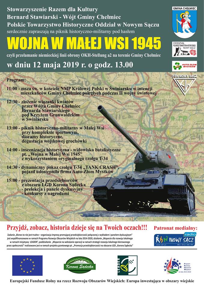 Szanowni Państwo w imieniu stowarzyszenia Razem dla Kultury, Wójta Gminy Chełmiec Bernarda Stawiarskiego oraz Polskiego Towarzystwa Historycznego, oddział w Nowym Sączu serdecznie zapraszamy 12 maja 2019 r. do Małej Wsi na piknik historyczno- militarny, który rozpocznie się o godz. 13:00. Podczas pikniku odbędzie się inscenizacja historyczna z wykorzystaniem oryginalnego jeżdżącego radzieckiego czołgu T-34. Po zakończeniu […]