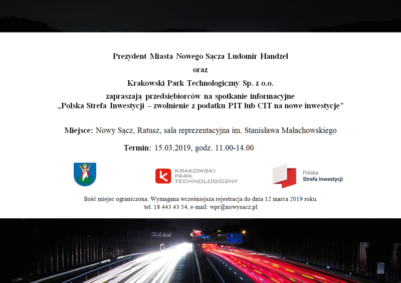 Prezydent Miasta Nowego Sącza Ludomir Handzel oraz Krakowski Park Technologiczny Sp. z o.o. zapraszają przedsiębiorców na spotkanie informacyjne dotyczące nowych zasad udzielania wsparcia w podejmowaniu inwestycji w Polskiej Strefie Inwestycji (dawnej Specjalnej Strefie Ekonomicznej), które odbędzie się w piątek, 15 marca, w godz. od 11.00 do 14.00 w Sali Reprezentacyjnej sądeckiego ratusza. Ilość miejsc […]