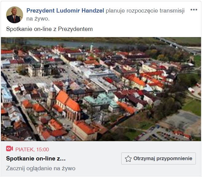 Prezydent Miasta Nowego Sącza Ludomir Handzel zaprasza na spotkanie on-line w piątek 21 grudnia o godzinie 15:00. Transmisja odbędzie się na portalu społecznościowym Facebook. Prezydent będzie odpowiadał na pytania internautów. Wystarczy być zarejestrowanym na portalu społecznościowym fb PREZYDENT LUDOMIR HANDZEL.