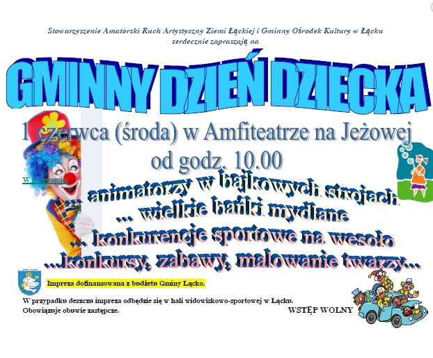 Stowarzyszenie Amatorski Ruch Artystyczny i Gminny Ośrodek Kultury w Łącku organizują Gminny Dzień Dziecka w dniu 1 czerwca od godz. 10.00 w Amfiteatrze na Jeżowej. W programie przewidziane są zabawy z animatorami, liczne konkursy z nagrodami i konkurencje sportowe na wesoło. Uczestnicy otrzymają słodycze i napoje. W przypadku deszczu impreza odbędzie się w hali widowiskowo-sportowej w […]