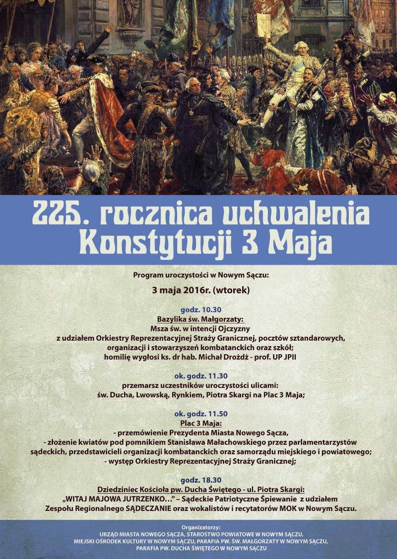 3 maja w Nowym Sączu odbędą się uroczyste obchody Uchwalenia Konstytucji 3 maja. Uroczystości rozpocznie Msza św. o godz. 10:30 w Bazylice Św. Małgorzaty, po których nastąpi przemarsz na Plac 3 Maja. Po złożeniu kwiatów pod pomnikiem Stanisława Małachowskiego przez parlamentarzystów sądeckich, przedstawicieli organizacji kombatanckich oraz samorządu miejskiego i powiatowego wystąpi Orkiestra Reprezentacyjna Straży Granicznej. […]