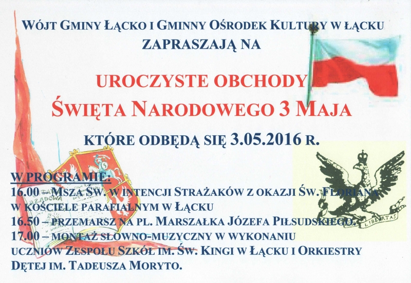 Wójt Gminy Łącko i Gminny Ośrodek Kultury serdecznie zapraszają na obchody Narodowego Święta Trzeciego Maja od godz. 16.00. 16.00 – Msza Św. w intencji strażaków z okazji Św. Floriana w kościele parafialnym w Łącku 16.50 – Przemarsz na Pl. Marszałka Józefa Piłsudskiego. 17.00 – Montaż słowno-muzyczny w wykonaniu uczniów Zespołu Szkół im. Św. Kingi w […]