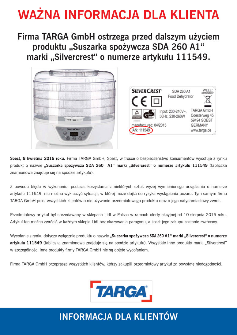 Kupiłeś suszarkę w Lidlu? Zwróć natychmiast!
