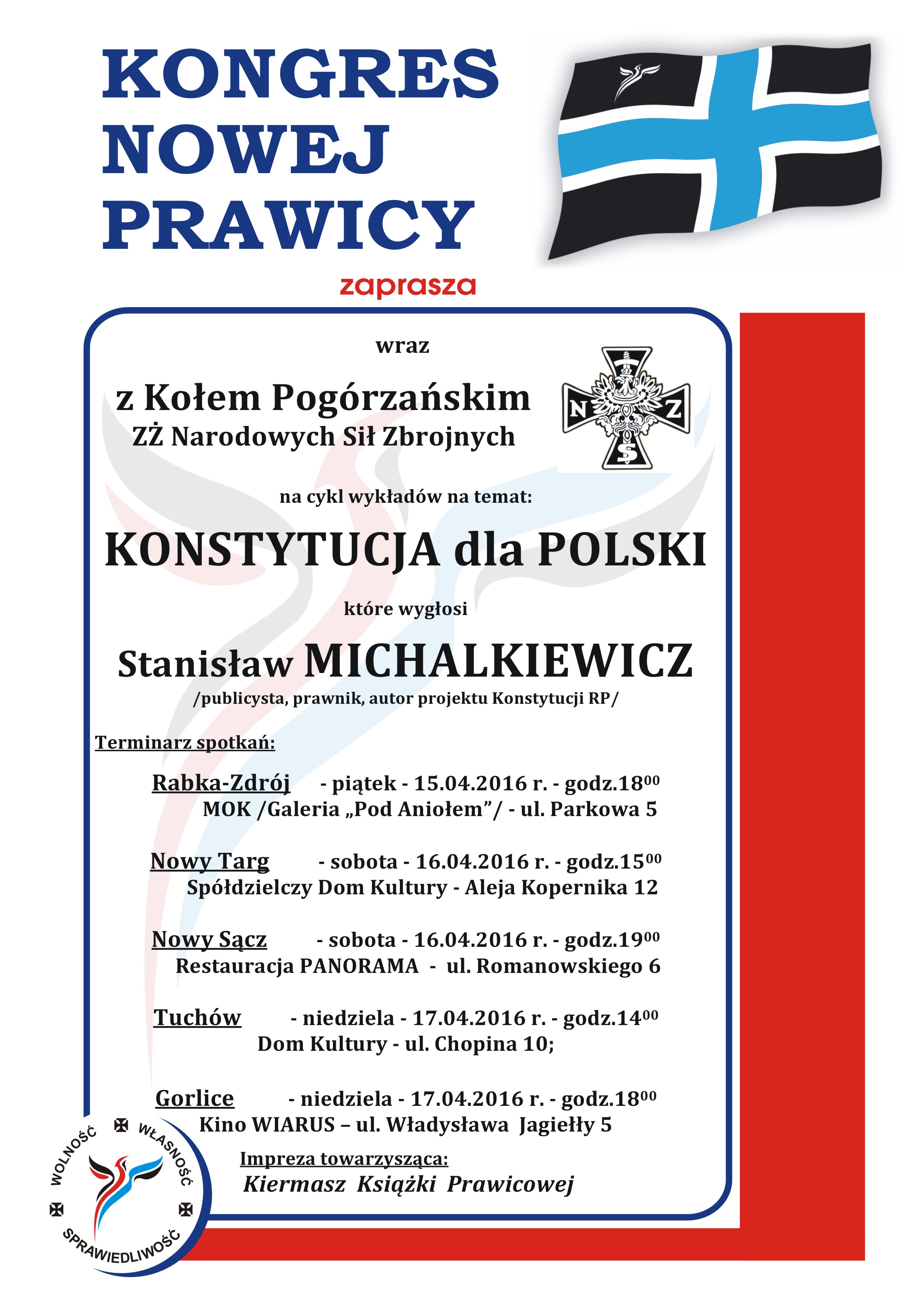 Oddział Nowosądecki KNP, we współpracy ze Związkiem Żołnierzy Narodowych Sił Zbrojnych zaprasza na tradycyjne, coroczne spotkania z Panem Stanisławem Michalkiewiczem. W ramach bogatej twórczości pisarskiej Stanisław Michalkiewicz jest także autorem projektu Konstytucji Rzeczypospolitej Polskiej opracowanego jeszcze w 1992 r. Pomimo upływu prawie ćwierćwiecza od napisania tego projektu, nie stracił on nic ze swej aktualności. Wprost przeciwnie! […]