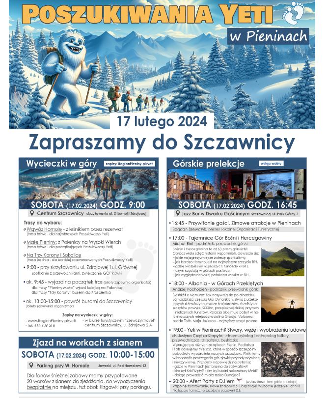 Lokalna Organizacja Turystyczna „Region Pieniny” organizuje w Szczawnicy 17 lutego 2024r (sobota) imprezę turystyczną „Poszukiwania Yeti w Pieninach”. -Chcemy w ten sposób promować odpowiedzialną turystykę zimową oraz pokazać, że Pieniny (Szczawnica) zimą to nie tylko narty -mówią Organizatorzy. W programie: – zwiedzanie siedziby GOPR w Szczawnicy – wycieczki w góry z przewodnikami i leśnikami – wieczorne […]