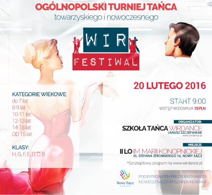 Taneczne emocje czekają na wszystkich uczestników Ogólnopolskiego Turnieju Tańca Towarzyskiego i Nowoczesnego – WirFestiwal. Wydarzenie odbędzie się w sobotę (20 lutego) na sali sportowej II Liceum Ogólnokształcącego w Nowym Sączu, a jego początek zaplanowano na godz. 9:00. Patronem Turnieju jest Prezydent Miasta Nowego Sącza Ryszard Nowak.