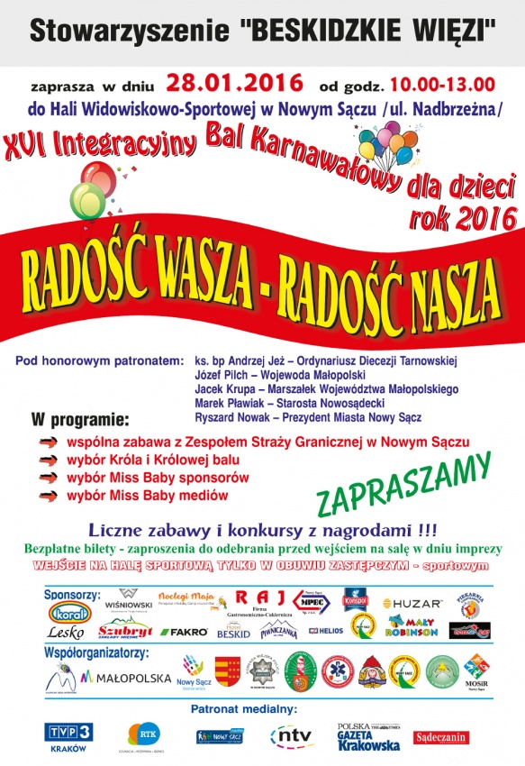 Pod honorowym patronatem Prezydenta Miasta Nowego Sącza Ryszarda Nowaka, w czwartek (28 stycznia) na hali sportowej MOSiR przy ulicy Nadbrzeżnej, odbędzie się XVI Integracyjny Bal Karnawałowy dla dzieci „Radość Wasza – Radość Nasza”. Jak co roku, najmłodsi uczestnicy mogą liczyć na wiele atrakcji, a wśród nich m.in. wspólna zabawa z Zespołem Straży Granicznej w Nowym […]