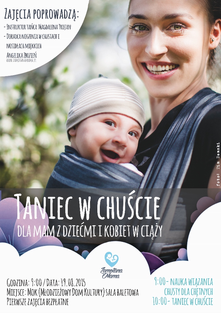 Już jutro zapraszamy wszystkie obecne i przyszłe mamy na bezpłatne zajęcia do MOK (Młodzieżowego Domu Kultury) w Nowym Sączu. O godzinie 9:00 rozpocznie się nauka wiązania chusty a o 10:00 taniec;) Zapraszamy!