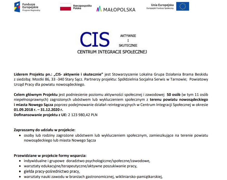 Stowarzyszenie Lokalna Grupa Działania „Brama Beskidu” oraz partnerzy: Spółdzielnia Socjalna Serwis oraz Powiatowy Urząd Pracy dla powiatu nowosądeckiego, realizujący projekt pn. „CIS – aktywnie i skutecznie” serdecznie zapraszają do udziału w projekcie: osoby lub rodziny zagrożone ubóstwem lub wykluczeniem społecznym, zamieszkujące na terenie powiatu nowosądeckiego lub m. Nowego Sącza Informujemy, że nabór formularzy rekrutacyjnych do […]