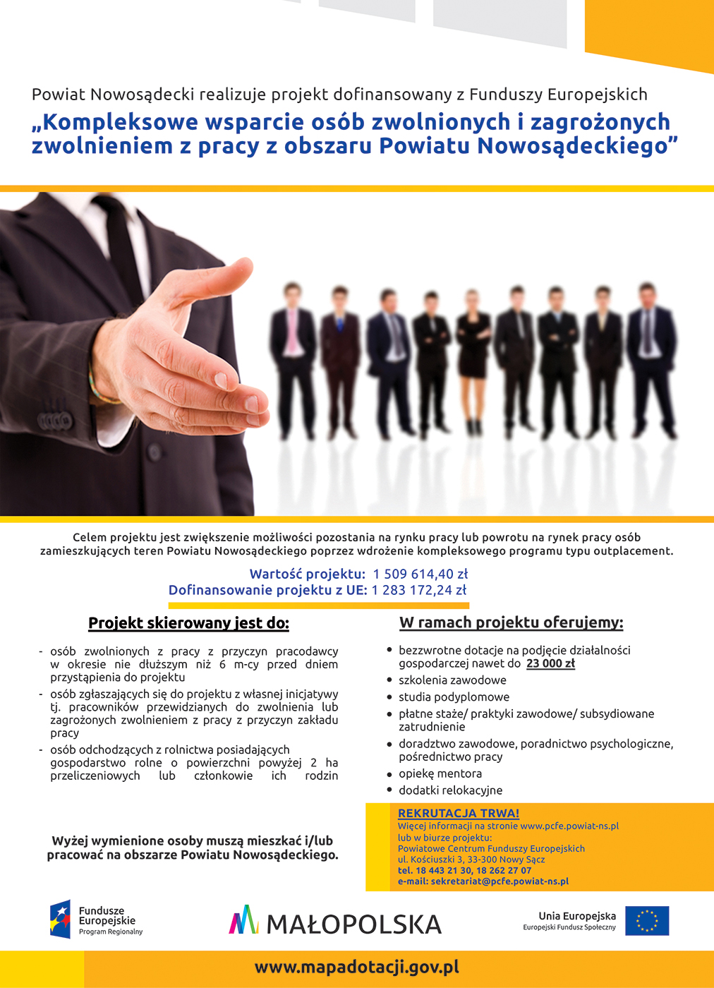 Możesz otrzymać nawet 23 tysiące złotych i pełny pakiet szkoleń, w jaki sposób prowadzić swoją firmę. Wystarczy przystąpić do projektu realizowanego przez Powiatowe Centrum Funduszy Europejskich w Nowym Sączu. Głównym celem projektu jest zwiększenie możliwości pozostania na rynku pracy lub powrotu na rynek pracy 40 osób zamieszkujących teren Powiatu Nowosądeckiego, zwolnionych z pracy z przyczyn […]