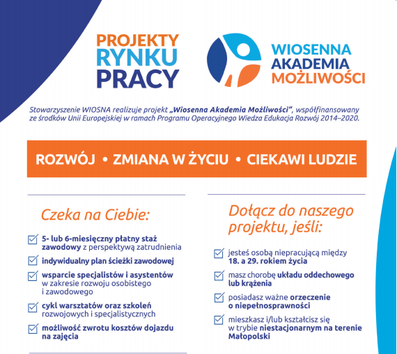 NIEPEŁNOSPRAWNI AKTYWNI Z WIOSNĄ Właśnie trwa rekrutacja do nowych programów aktywizacji zawodowej dla osób niepełnosprawnych z terenu Małopolski! Płatne staże, stypendia, specjalistyczne szkolenia i warsztaty to tylko niektóre z form wsparcia, jakie Stowarzyszenie WIOSNA oferuje uczestnikom swoich projektów. AKTYWNI, POTRZEBNI, KOMPETENTNI – KOMPLEKSOWY PROGRAM AKTYWIZACJI ZAWODOWEJ OSÓB NIEPEŁNOSPRAWNYCH 30+ W MAŁOPOLSCE i WIOSENNA AKADEMIA MOŻLIWOŚCI […]