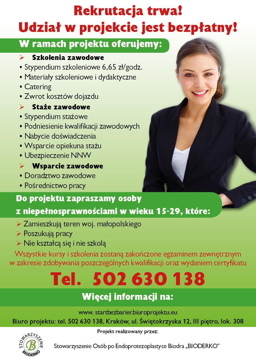 Płatne staże, szkolenia, doradztwo zawodowe i pośrednictwo pracy to oferta w ramach projektu Start bez Barier. Z oferty mogą skorzystać osoby niepełnosprawne do 29. roku życia, bierne zawodowo lub bezrobotne. Udział jest bezpłatny. Stowarzyszenie Osób po Endoprotezoplastyce Biodra „Bioderko” zaprasza osoby niepełnosprawne do 29. roku życia, bierne zawodowo lub bezrobotne, do udziału w projekcie Start […]