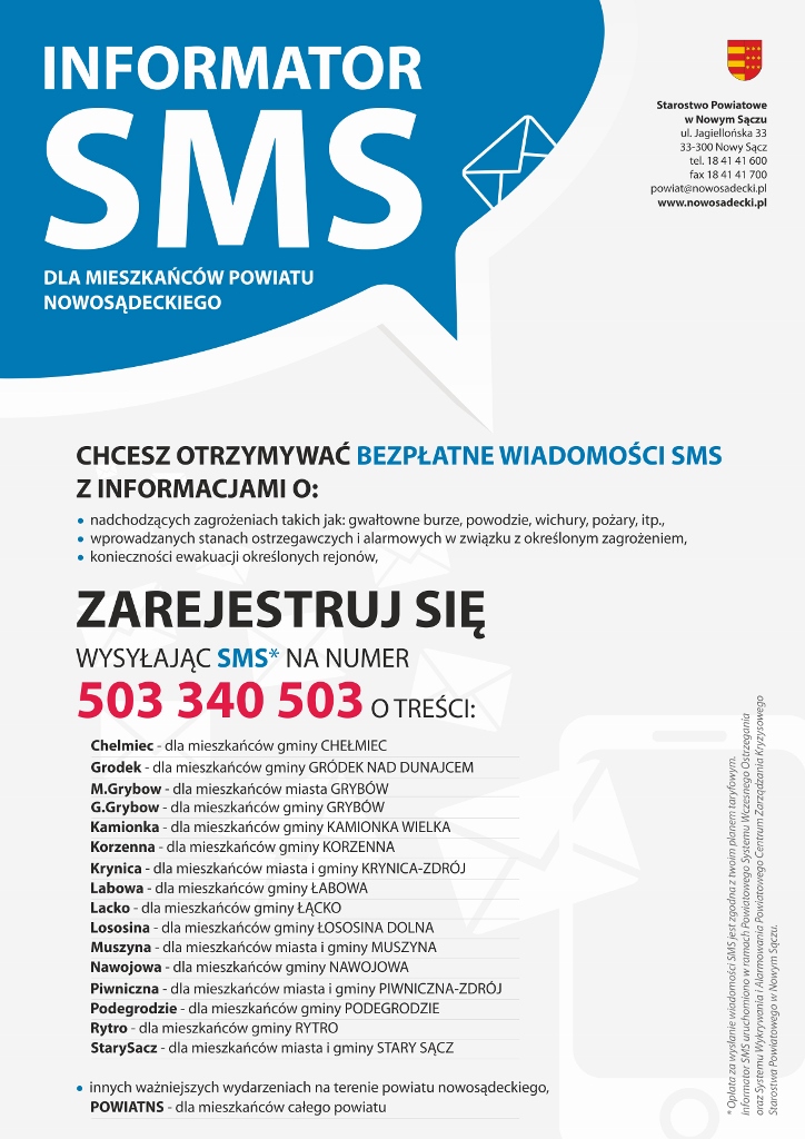 Starostwo Powiatowe uruchamia system szybkiego powiadamiania o sytuacjach kryzysowych, ale też najważniejszych wydarzeniach na terenie Powiatu Nowosądeckiego. Wszyscy, którzy zalogują się do systemu, będą otrzymywać bezpłatne smsy. – Zachęcam do zarejestrowania się w systemie informacyjnym – mówi starosta nowosądecki Marek Pławiak. – Warto wiedzieć, co się dzieje na Sądecczyźnie, szczególnie w sytuacjach kryzysowych. Mieliśmy już […]