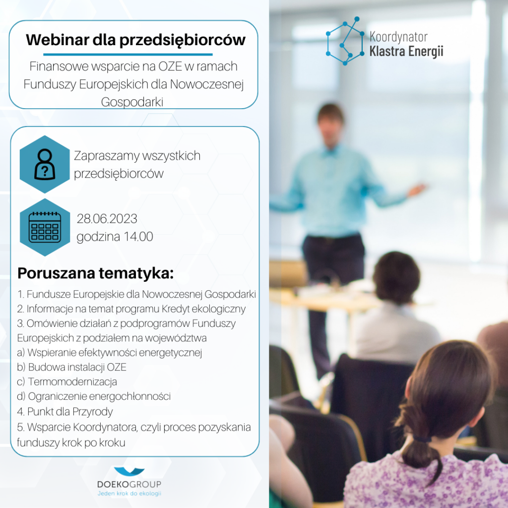 Serdecznie zapraszamy wszystkich przedsiębiorców działających na terenie naszej gminy na bezpłatny webinar pt. „Finansowe wsparcie na OZE w ramach Funduszy Europejskich dla Nowoczesnej Gospodarki”, który odbędzie się 28 czerwca 2023 roku o godzinie 14.00. Aby wziąć udział w wydarzeniu należy zarejestrować się poprzez poniższy link: https://doekogroup.clickmeeting.com/przedsiebiorcy-webinar
