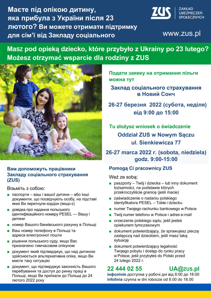 W najbliższy weekend 26 i 27 marca 2022 r. od godz. 9:00 do 15:00 Zakład Ubezpieczeń Społecznych organizuje specjalną akcję „Weekend dla Ukrainy”. Placówki w Nowym Sączu, Gorlicach, Limanowej, Nowym Targu i Zakopanem będą otwarte dla obywateli Ukrainy. Wniosek o świadczenie wychowawcze 500+ (SW-U) na dziecko, które jest obywatelem Ukrainy i przybyło z Ukrainy do […]