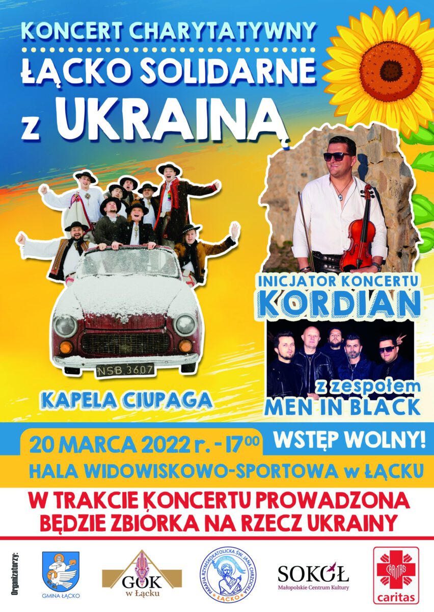 Serdecznie zapraszamy na Koncert charytatywny pn. „Łącko solidarne z Ukrainą”, który odbędzie się 20 marca 2022 r. o godz. 17.00 w Hali Widowiskowo-Sportowej w Łącku. Podczas wydarzenia wystąpią KORDIAN – inicjator koncertu, któremu towarzyszył będzie zespół Men In Black, a także Kapela CIUPAGA.Wstęp wolny.Podczas koncertu będzie prowadzona zbiórka na rzecz Ukrainy.Już dziś zapraszamy do udziału.